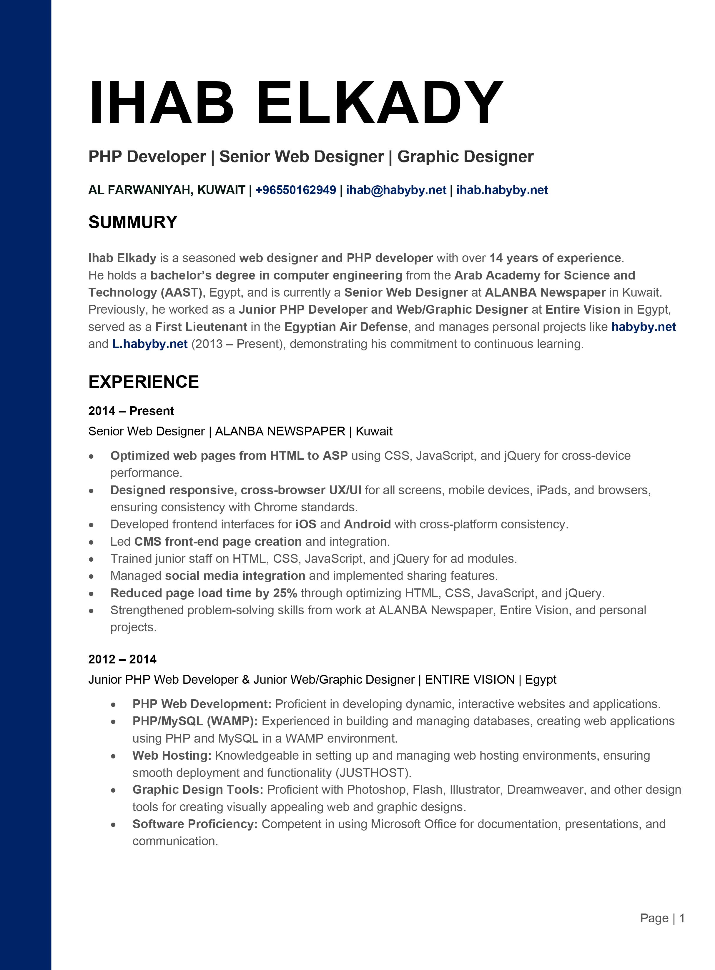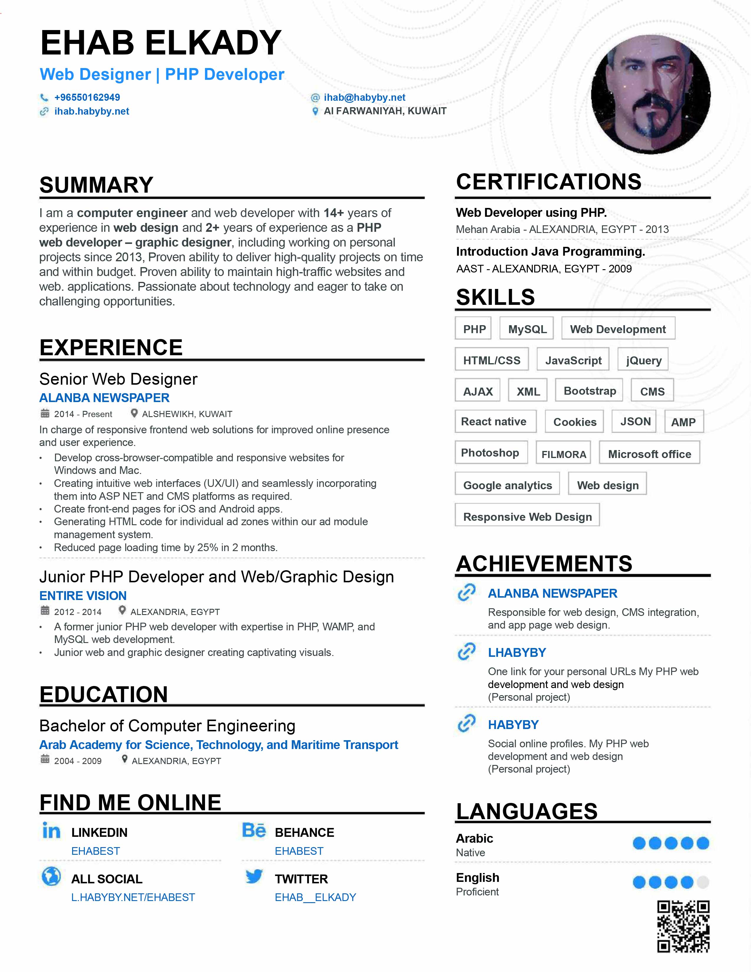 Senior Web Designer at Alanba Newspaper (Kuwait) with expertise in PHP development and UI/UX design.